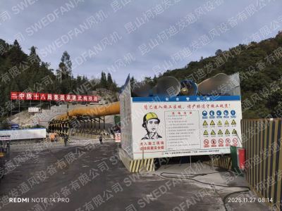 2025年的11月17日SWEDFAN 2xAVH-R180.250.4.10风机1台,在湖北省襄阳市谷城县城关镇白龙岗区中国水电四局-引江补汉9标23#平洞项目,完成安装调试,投入运行。经1280米平洞给和正洞大、小里程(1764米、3716米)施工开挖提供通风保障。